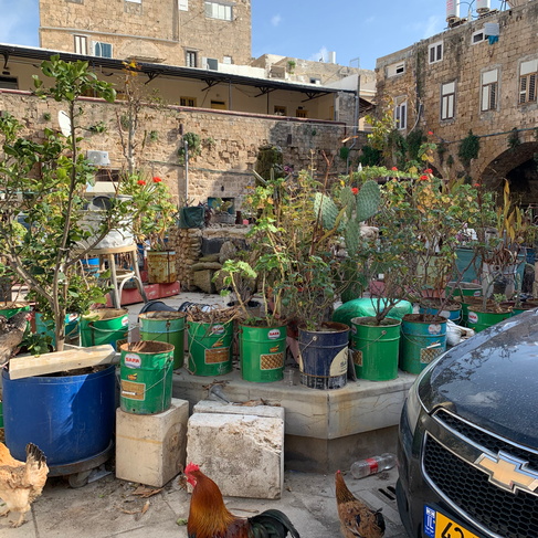 Right outside is a small community garden with chickens and cats. They get along well. As we exit, we see them all napping in the sun.